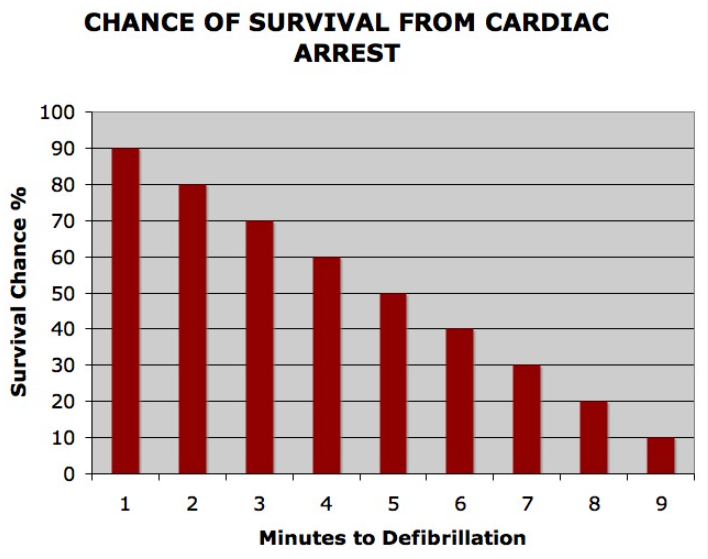 The chance of survival decreases by 10% for every minute that passes from time of collapse to defibrillation.